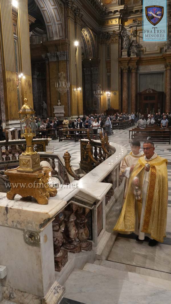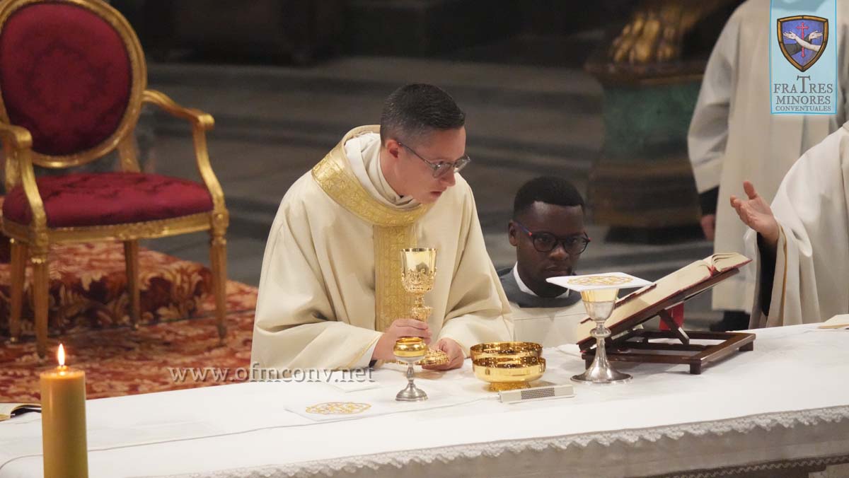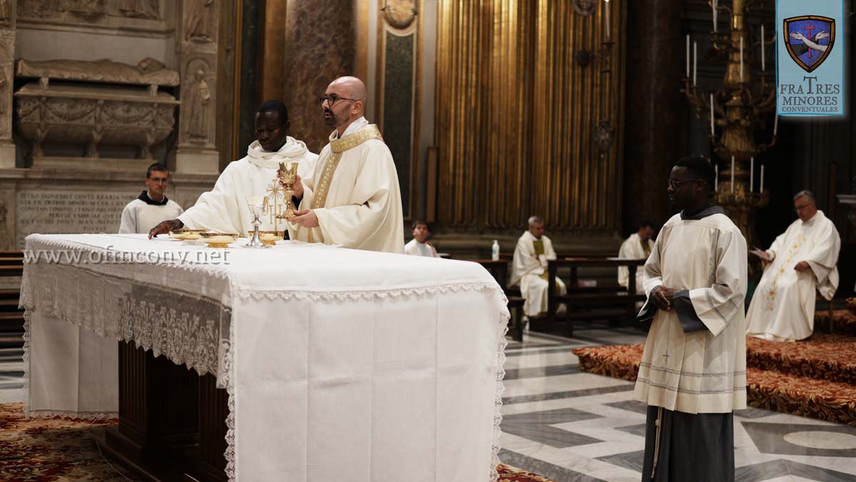 Il triduo di preparazione alla solennità del Serafico Padre, nella nostra magnifica Basilica e Santuario dei Santi Apostoli Filippo e Giacomo il Minore, preparata con cura dal sacrista fra Maurizio VADILONGA, si è svolto attraverso diversi momenti celebrativi: intronizzazione della reliquia del Santo e preghiera della corona francescana; le celebrazioni eucaristiche del 1 e del 2 ottobre presiedute dai due novelli presbiteri conventuali, rispettivamente l’ucraino fra Vladyslav PASHAYEV e il libanese fra Joseph Naim TOUMA, e concelebrate dai frati della comunità; la celebrazione del Transito del 3 ottobre presieduta dal guardiano e parroco fra Francesco CELESTINO; infine la celebrazione Eucaristica nella solennità di San Francesco d’Assisi il 4 ottobre, presieduta dal confratello Cardinale François-Xavier BUSTILLO, durante la quale ha emesso i voti solenni fra Julius BANDA della Provincia religiosa dei Santi Protomartiri francescani nello Zambia, nelle mani del Ministro generale dell’Ordine fra Carlos A. TROVARELLI. Alla fine della celebrazione, l’agape fraterna in Convento nella sala dell’Immacolata.