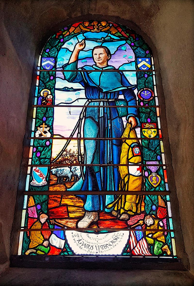 In the early morning hours of D-Day, Friar Ignatius parachuted with many troops into occupied territory, the hamlet of Guetteville in the town of Picauville. An American glider had crashed nearby. There were many casualties. He immediately began ministering to the wounded paratroopers and glider victims. Realizing that a suitable aid station would be needed, Friar Ignatius calculated a risky strategy: attempting negotiations with his German counterpart in the peaceful hope of combining their wounded together in one common hospital. Walking between enemy lines unarmed, with helmet hanging from his belt, and wearing his chaplain’s insignia and a Red Cross armband, he bravely went to meet with the head Nazi medic. As he returned through the no-man zone to the American side, he was shot in the back by an enemy sniper, becoming the only U.S. chaplain to be killed on D-Day. He was thirty-two, in the fifth year of his priesthood.