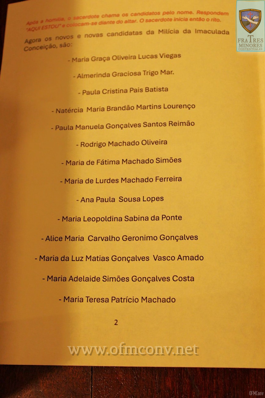 Since 2022, a small group of faithful from several hamlets around Assafarge have been gathering at the Conventual Franciscan Friary of Sant’Antonio dos Olivais, located twelve kilometers [seven miles] from Coimbra. It has been their firm intention to start and M.I. group. They asked to be guided by Friar Fabrizio BORDIN, who had recently arrived at the friary. Over the course of three years, the faithful undertook a formation course on the life of St. Maximilian Kolbe, the history of the beginnings of the Militia of the Immaculata in Rome, the spirit and charism of the M.I., and the meaning and fruits of consecrating oneself to the Immaculata.