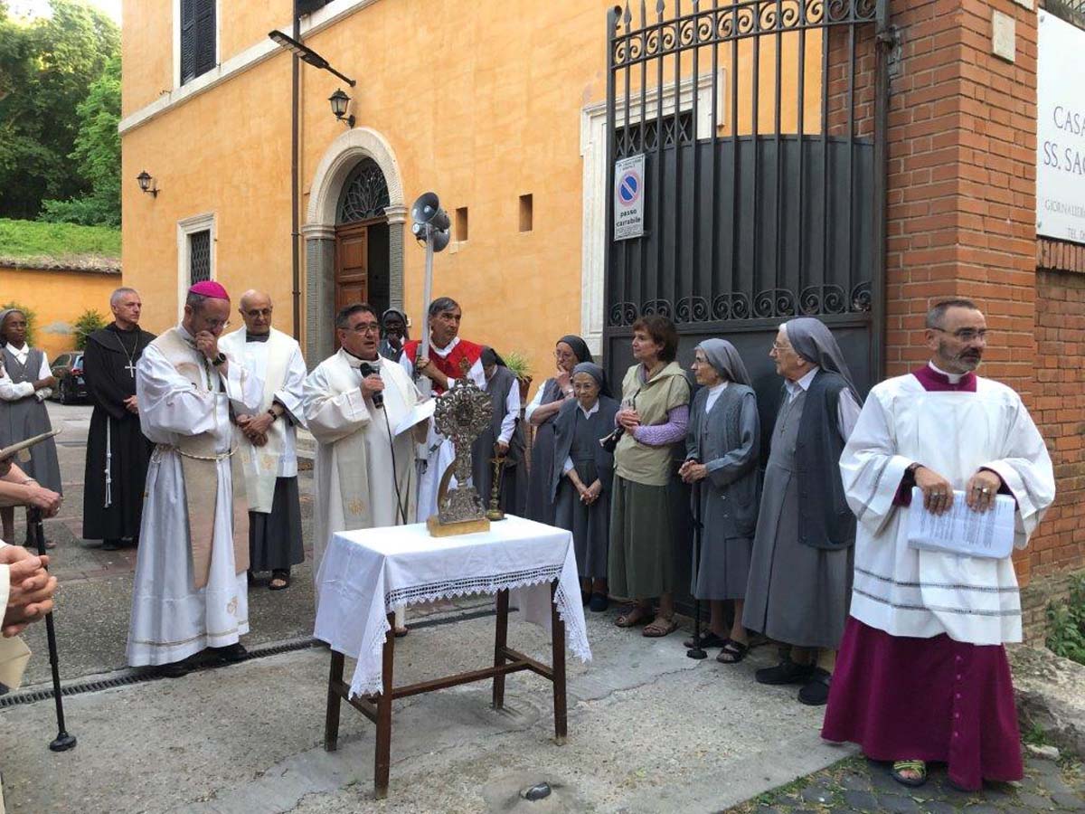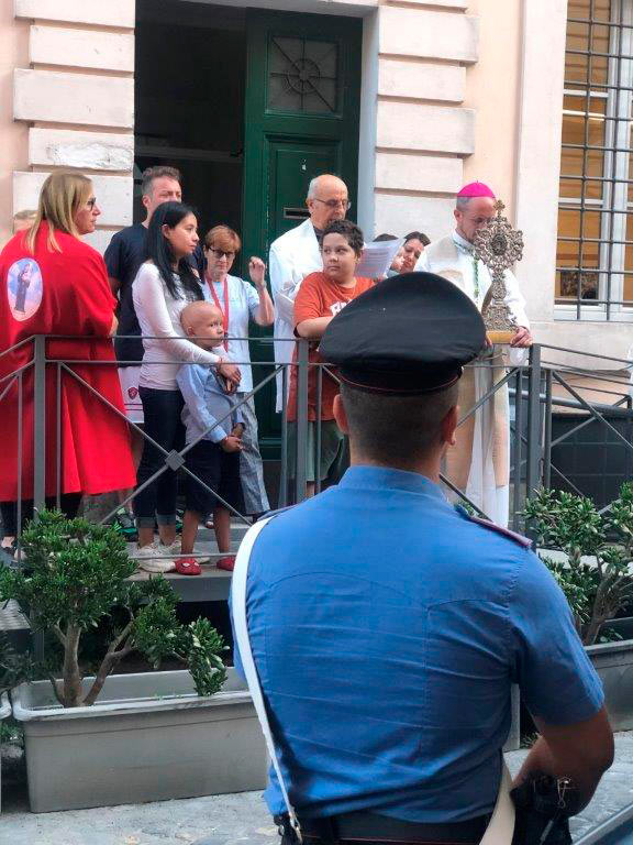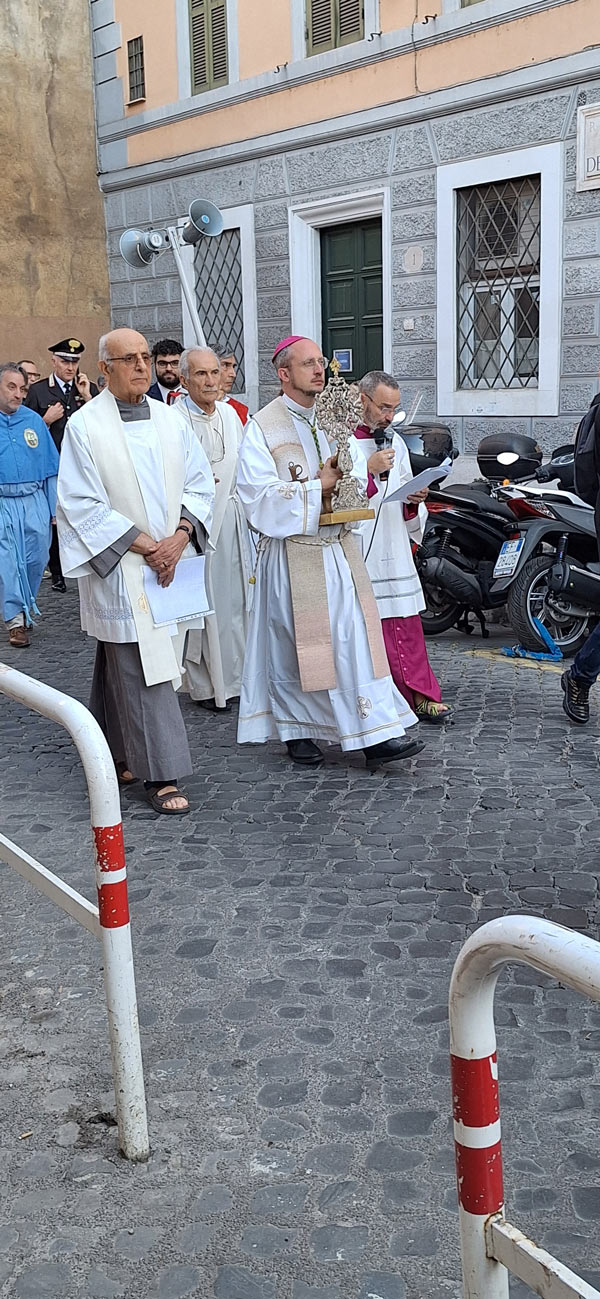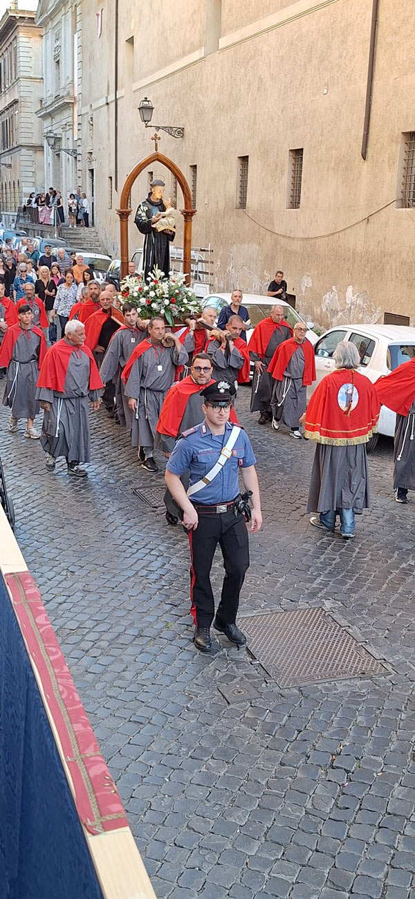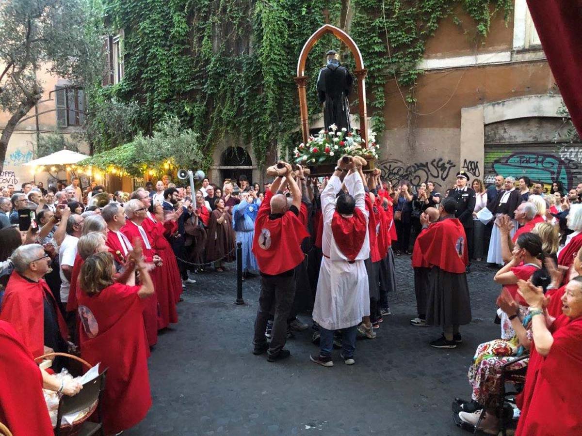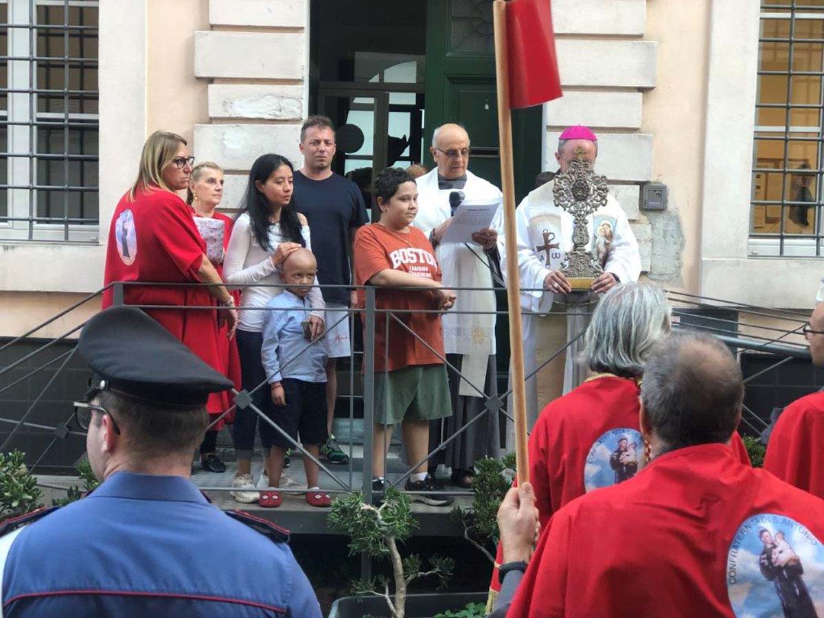 After Mass, a procession was conducted through the streets of Trastevere with a statue of St. Anthony carried on the shoulders of the Confraternity members. Archbishop PACE led the procession carrying a relic of St. Anthony. Those present at the procession included the Most Reverend Vittorio VIOLA, OFM, Secretary of the Dicastery for Divine Worship and the Discipline of the Sacraments; Friar Umberto FANFARILLO, Pastor of Santa Dorotea; Friar Sergio COGNIGNI, the Associate Pastor; representatives of other Confraternities in Rome’s historic city center, and the Lazio Region Band. The songs and prayers along the route were led by the Master of Ceremonies, Ezio FALINI. The statue of St. Anthony made three stops along the processional route. The first was in front of the San Giacomo alla Lungara Church, where the Guardian, Friar Renzo DEGNI, read the prayer. The inmates of the Regina Coeli prison were blessed with the relic as well. The second was in front of the Peter Pan Center to bless the sick children being treated at the Bambin Gesù Hospital. The third stop was in front of the Institute of the Sacramentine Sisters to bless the elderly living in the retirement home.