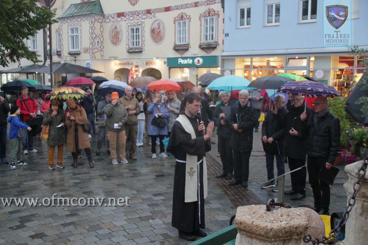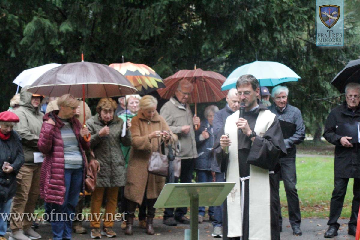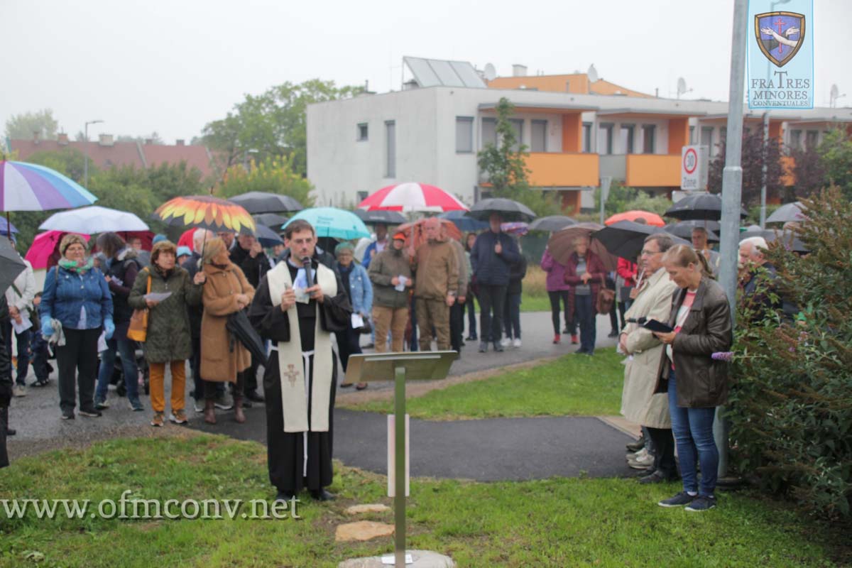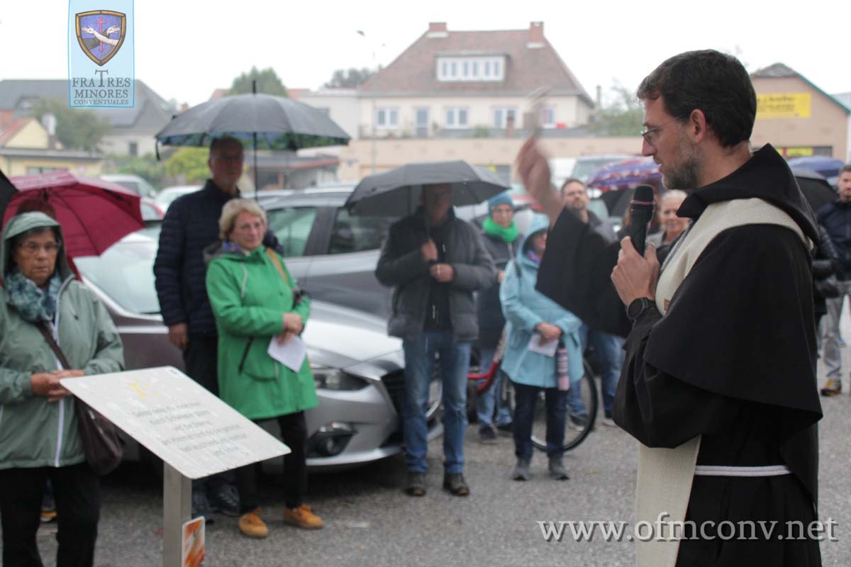 Na początku uroczystości, rozpoczętej przy mżawce – wielbimy Pana za siostrę wodę – kustosz i proboszcz parafii Wniebowzięcia NMP fr. Bernhard LANG powitał ponad stu przybyłych parafian, członków Franciszkańskiego Zakonu Świeckich i Młodzieży Franciszkańskiej, a także przedstawicieli władz cywilnych: honorowego burmistrza Herberta OSTERBAUER, burmistrza Wartmannstetten Martina SCHERZ oraz reprezentanta burmistrza Neunkirchen Günthera STELLWAG. Wszyscy razem przeszli szlak i zainaugurowali każdą poszczególną stację.