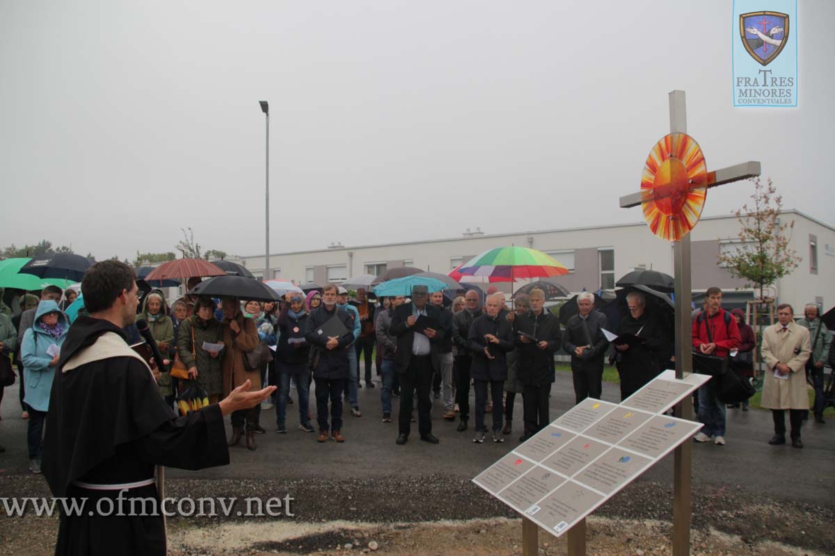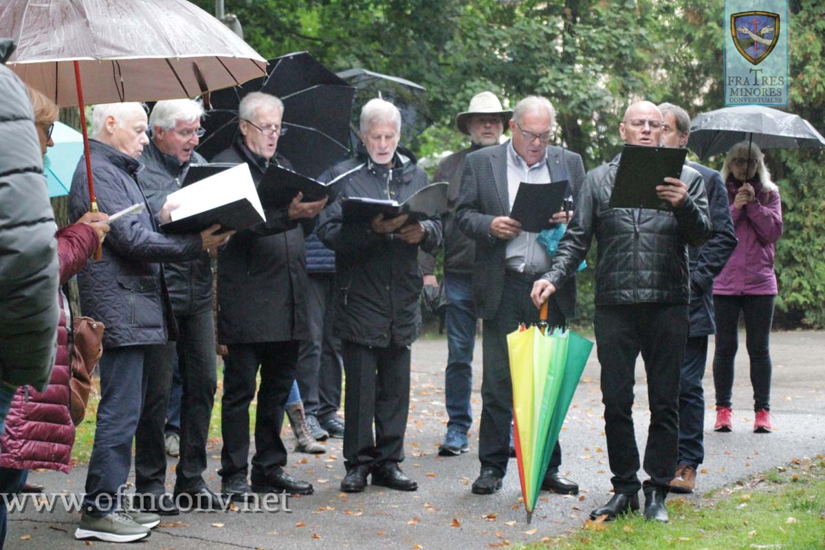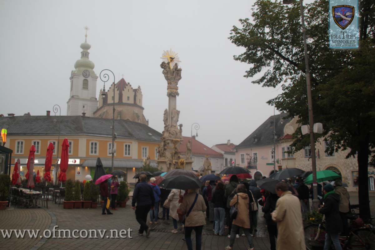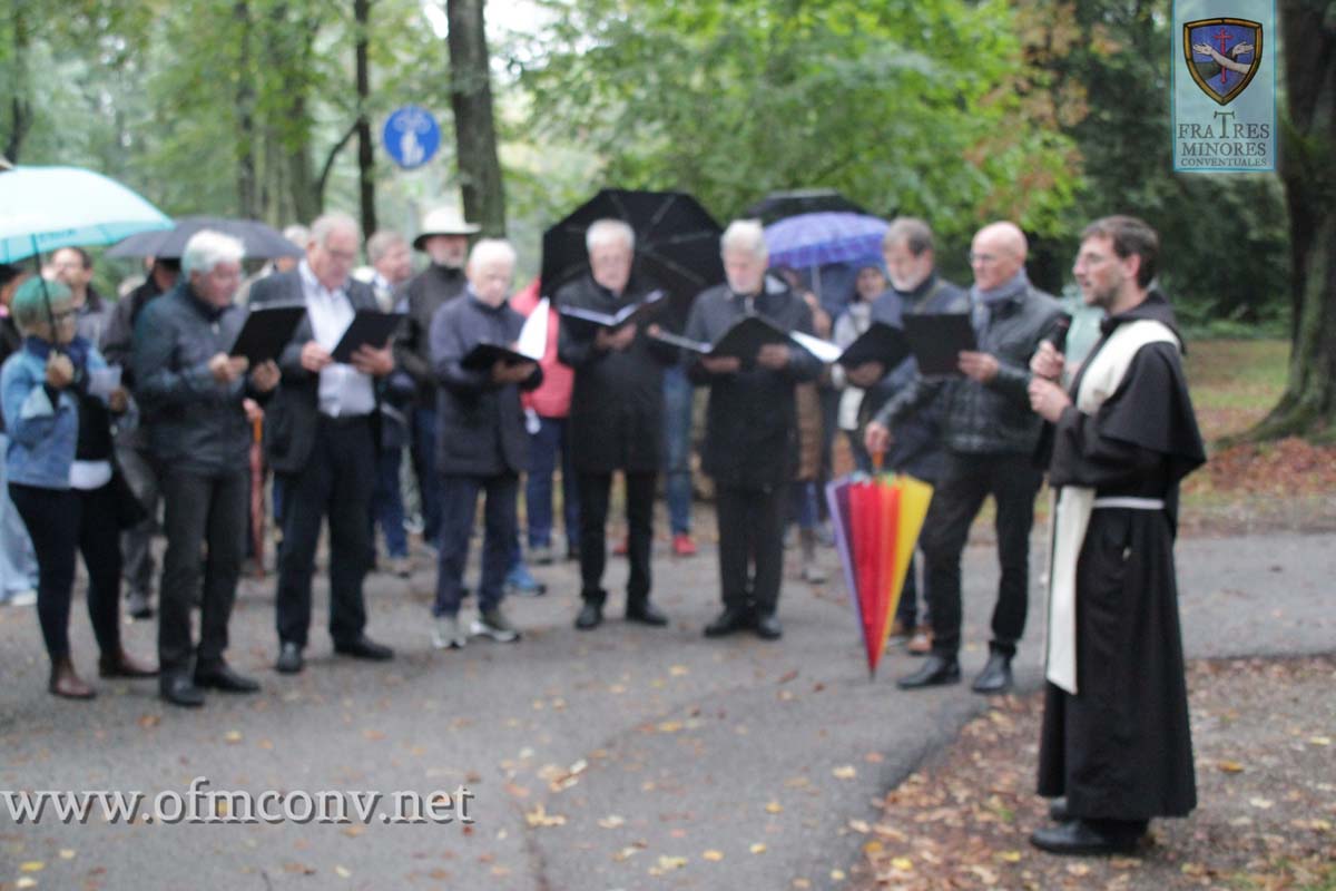 Na początku uroczystości, rozpoczętej przy mżawce – wielbimy Pana za siostrę wodę – kustosz i proboszcz parafii Wniebowzięcia NMP fr. Bernhard LANG powitał ponad stu przybyłych parafian, członków Franciszkańskiego Zakonu Świeckich i Młodzieży Franciszkańskiej, a także przedstawicieli władz cywilnych: honorowego burmistrza Herberta OSTERBAUER, burmistrza Wartmannstetten Martina SCHERZ oraz reprezentanta burmistrza Neunkirchen Günthera STELLWAG. Wszyscy razem przeszli szlak i zainaugurowali każdą poszczególną stację.